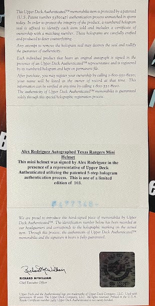 Alex Rodriguez Autographed Mini Helmet 27/103 UDA COA Rangers Limited